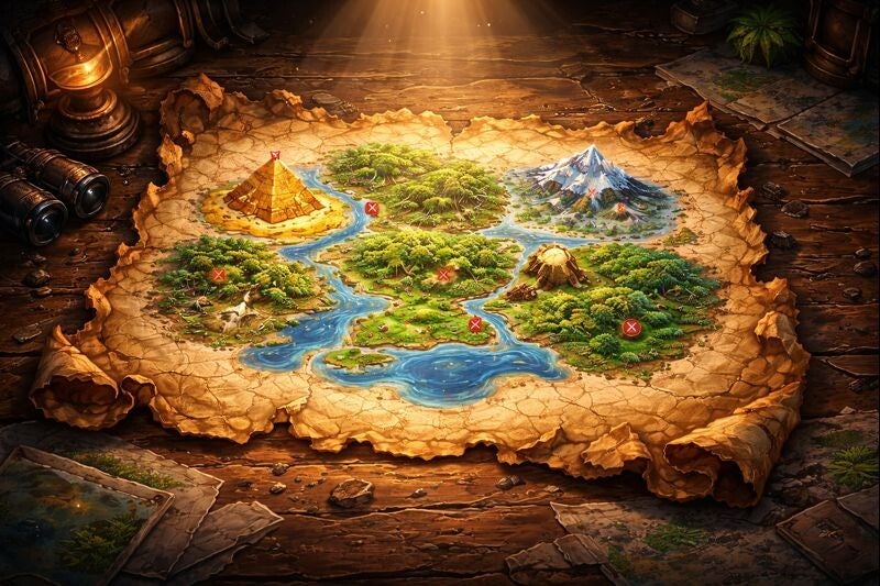 Este mapa antiguo, arrugado y marcado por quemaduras, fue lo único que sobrevivió. Al principio parecía solo un dibujo viejo, pero pronto descubrimos que escondía algo más: los biomas del planeta y los caminos para recuperar lo que habíamos olvidado. Desde entonces, mi vida ha sido explorar esta isla.